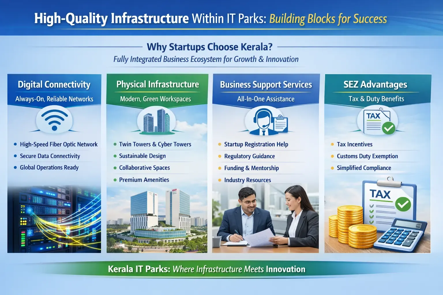 - Business support services - IT parks in Kerala provide comprehensive support services. This includes business registration assistance, regulatory compliance guidance, financing facilitation, and access to industry-specific resources.